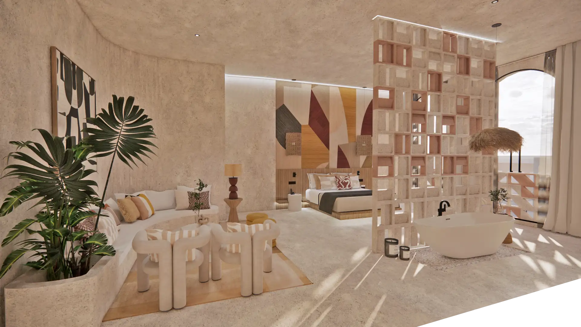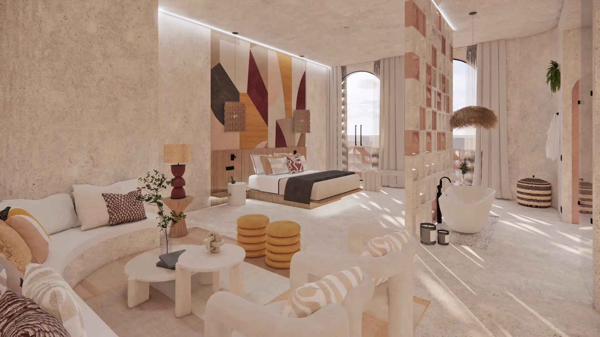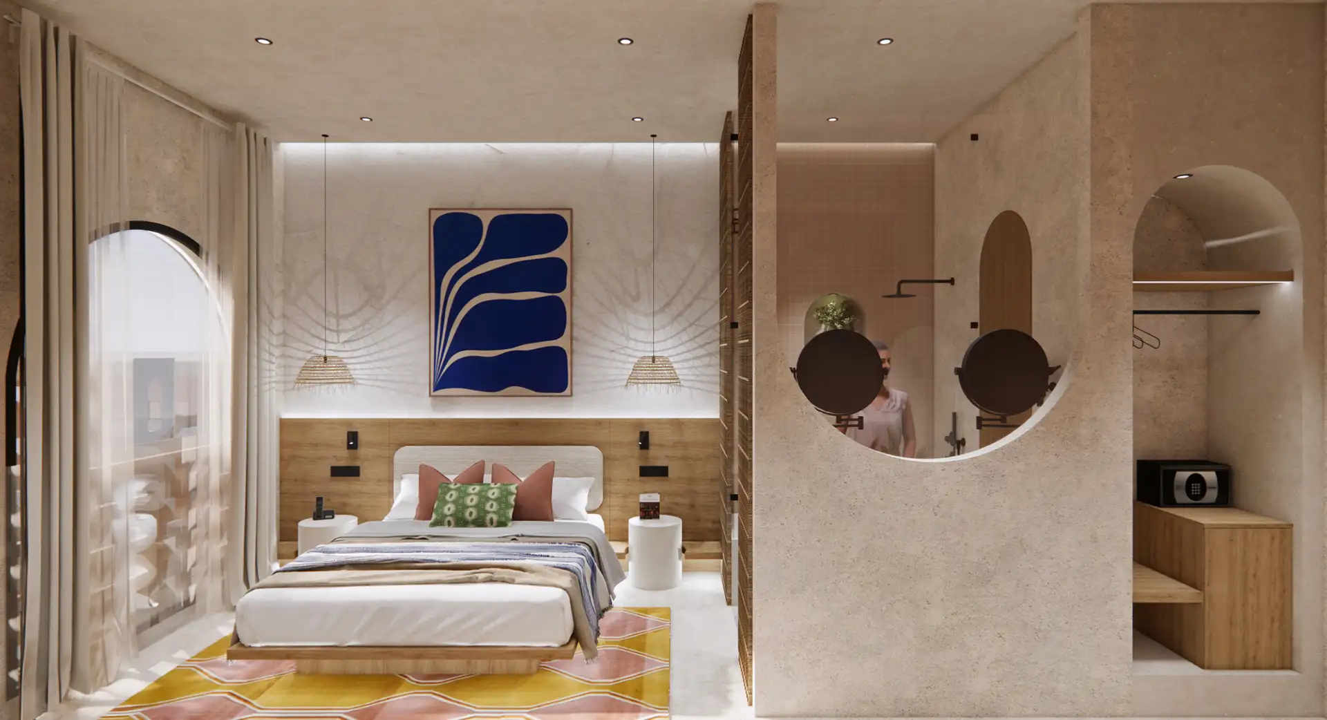 Las habitaciones tienen una paleta de colores cuidadosamente seleccionada y muebles de diseño que complementan la estética general del hotel. Cada detalle evoca una conexión con la vida y el espíritu vibrante de la ciudad.